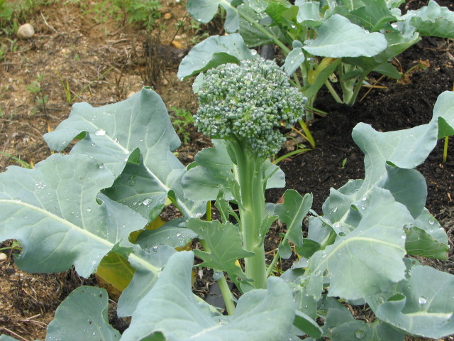 OSU Broccoli seed germination was erratic with only about 50% viability and several percent obviously growth-impaired seedings which left me with a smaller population of plants than I would have liked. All plants were transplanted into the field. During the first week a few plants were taken by cut worms (collars quickly made out of newspaper stopped the larvae) and later a few plants scattered among the planting mysteriously wilted and died. These plants had a damaged root system with very little root growth. Other than those problems the plants have remained healthy and surprisingly free of pests.