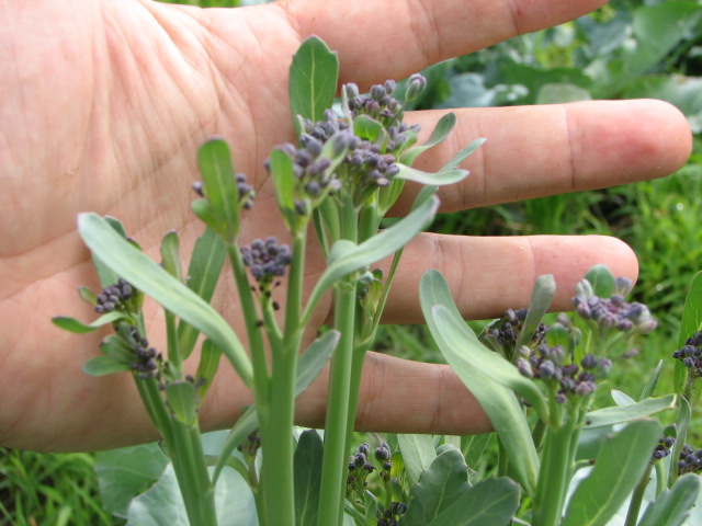 Because I liked the early heading extended stem trait, I transplanted those plants exhibiting the trait to another more isolated section of the garden so that they could cross with each other as a separate population. Otherwise those traits would be diluted with the pollen from the other plants. I don't attempt to hand-pollinate broccoli flowers because I have a large population of pollinating insects and can accomplish the same end result by isolating plants. If care is taken in removing a large enough root ball, broccoli can transplant well even when mature. Vegetative (non-heading) side sprouts can also be selected from plants of your choice and can be rooted with some ease to increase production of especially good plant selections.