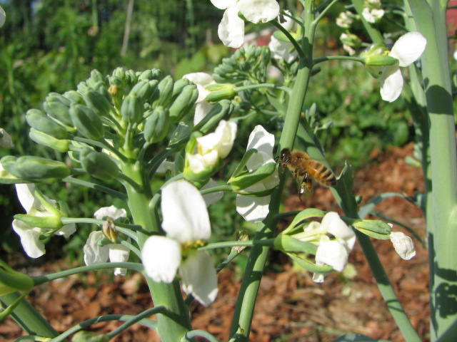 Once broccoli starts to flower, it bolts quickly and attracts many kinds of insect pollinators. We get an equal number of bumble bee and honey bees working the flowers as well as flies and cabbage butterflies. I'm ready for the cabbage butterfly larvae with dipel dust but so far no sign of those pesky green caterpillars. Rarely, broccoli can self-pollinate but mostly it doesn't. Sometimes pollination is hit or miss and seed production can be erratic. Pollen will generally have to be transferred among several plants. This self-incompatibility seems to facilitate chance hybrids that show greater vigor.